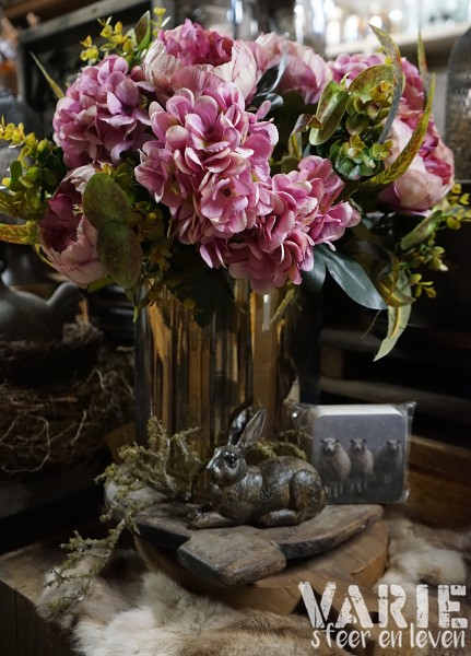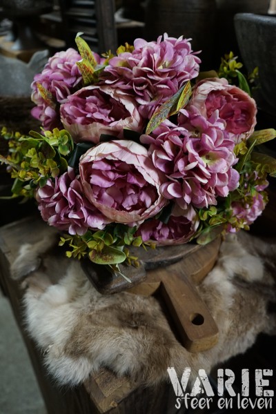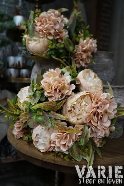 Deze volle boeketten met pioenrozen, hortensia’s en groen zijn helemaal compleet en direct klaar om neer te zetten. Altijd mooi, geen onderhoud — puur genieten ✨