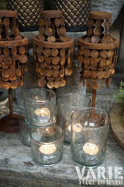 • Sobere kandelaar met dennenappel – oude patina look leverbaar in 2 maten.