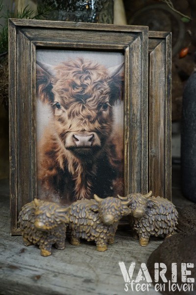 In Opende staan ze volop: de Schotse Hooglanders! Haal een stukje landelijke charme in huis met deze houten lijst van een jonge Hooglander. Prachtig voor aan de muur in de woonkamer, keuken of hal.