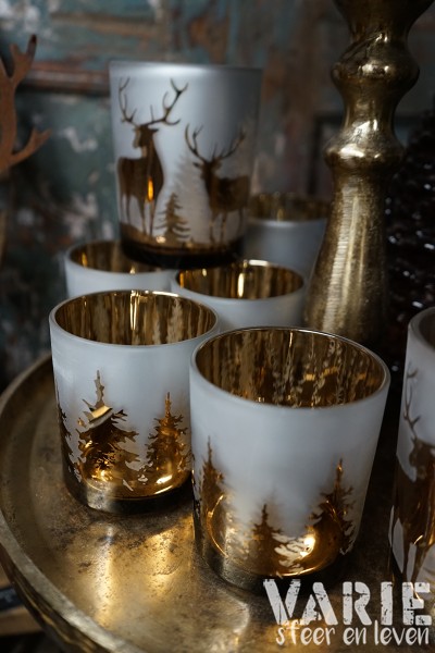 Deze sfeervolle windlichten brengen meteen warmte in huis. Het matte glas, gecombineerd met het gouden interieur, laat het licht prachtig doorschijnen langs het silhouet van dennenbomen en hertjes. Perfect voor de wintermaanden, de feestdagen of gewoon voor een knus hoekje in huis.